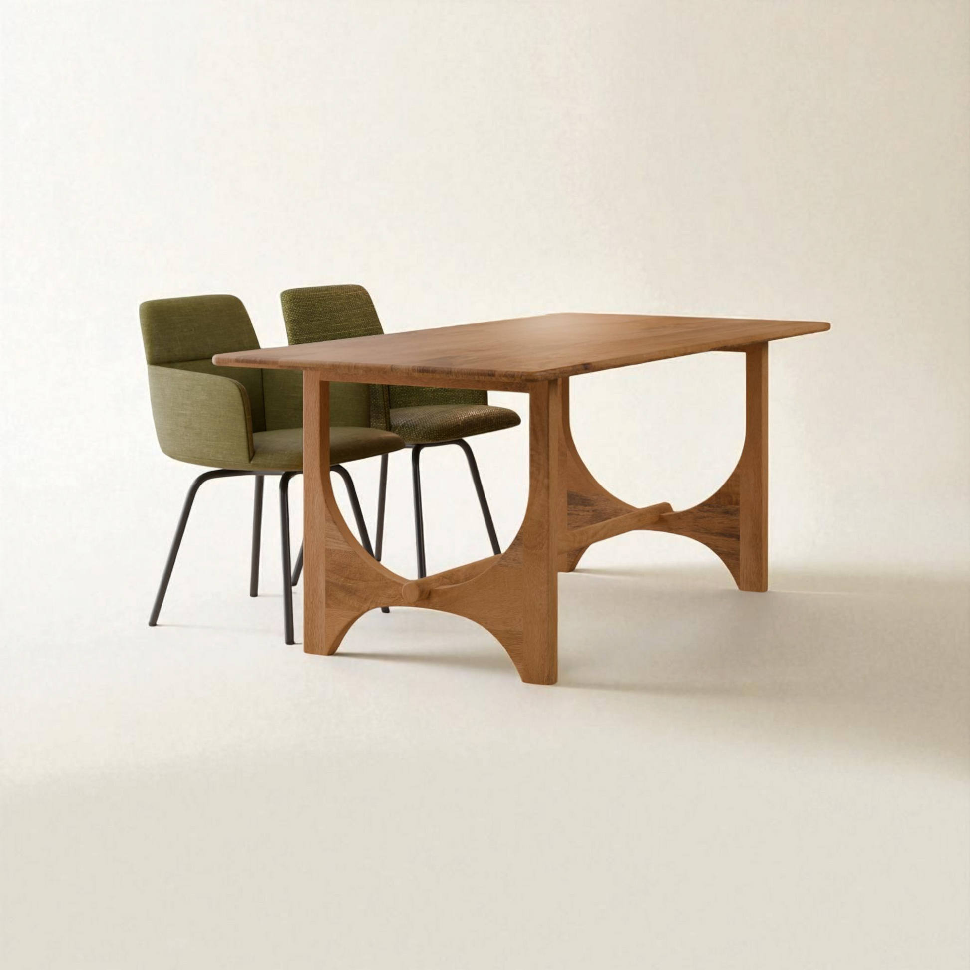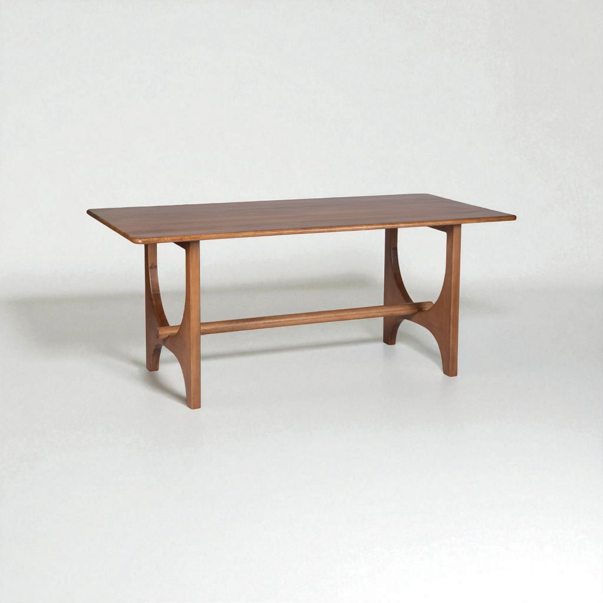 Crafted from solid mango wood with a rich walnut finish, the Breanna Dining Table brings a welcoming, communal vibe to your space. The expansive rectangular top rests on trestle legs, offering a timeless aesthetic. Whether hosting family dinners or styling a restaurant's dining area, Breanna can comfortably sit 6. It complements with contemporary, eclectic, bohemian, and modern settings.