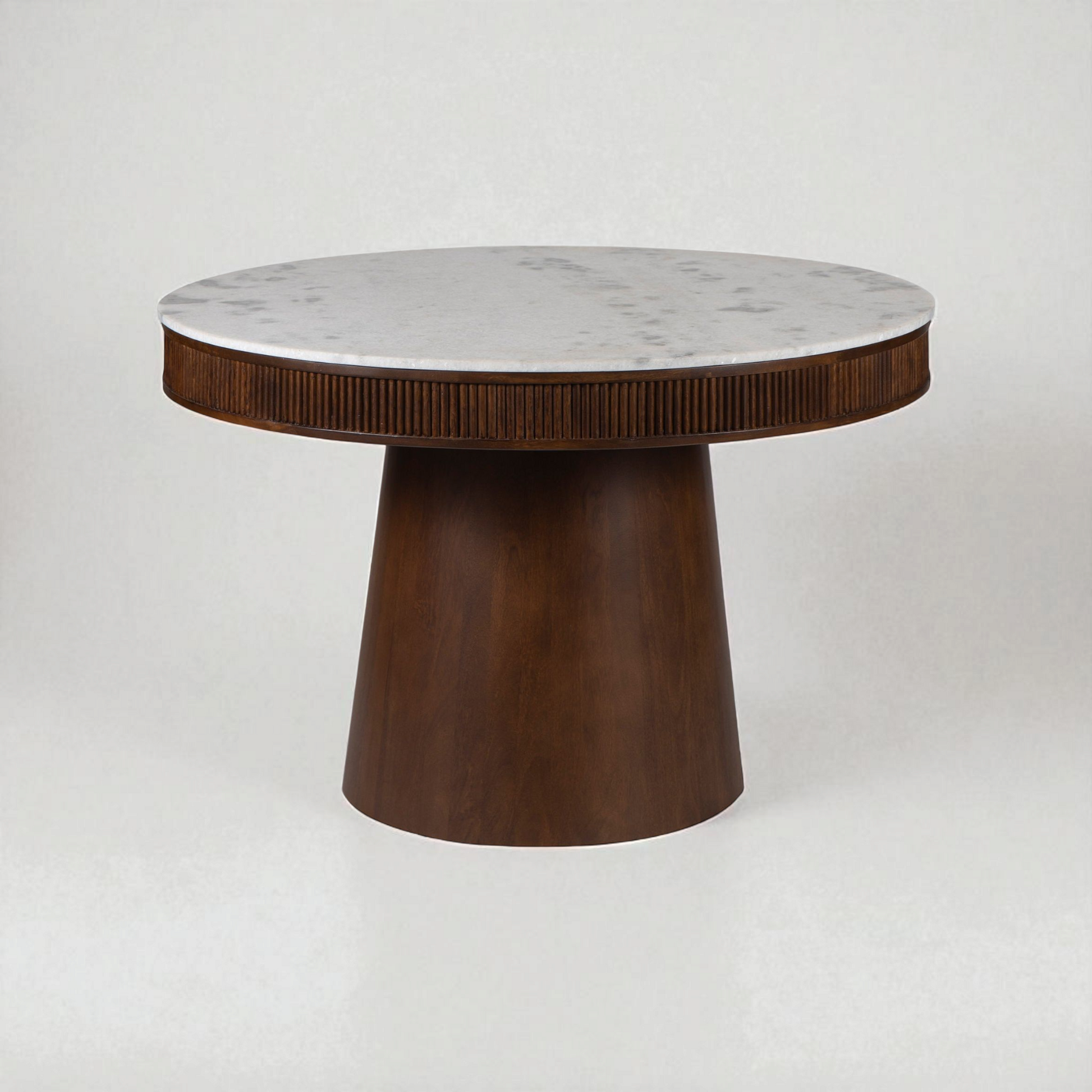 The Noah Dining Table combines quiet luxury with modern elegance. Designed to comfortably seat four, its conical base is crafted from high-quality mango wood with a rich walnut finish, offering both durability and warmth. Its striking round white marble top reveals intricate grains and veining, making each piece unique. Ideal for intimate gatherings or casual meals, Noah complements contemporary, coastal, and tropical interior styles.