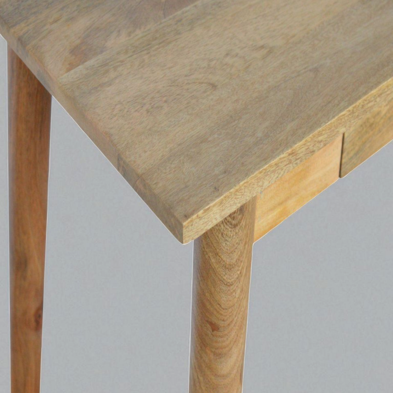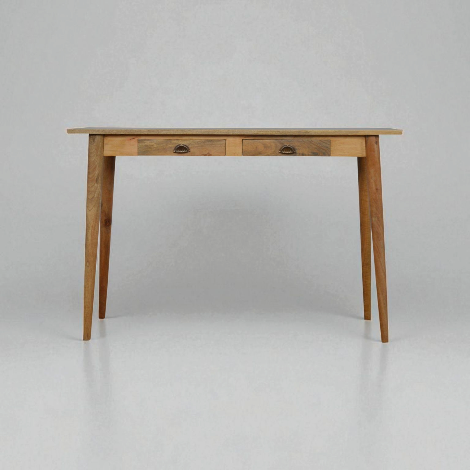 This timeless, light solid wood writing desk takes on the sleek lines of a Nordic style. Set on 4 Nordic style legs with soft assembling, this vintage desk has all the essential storage: decent sized table top and 2 drawers that come with shell handles. This writing desk is constructed from 100% solid mango wood has a smooth oak-ish finish.